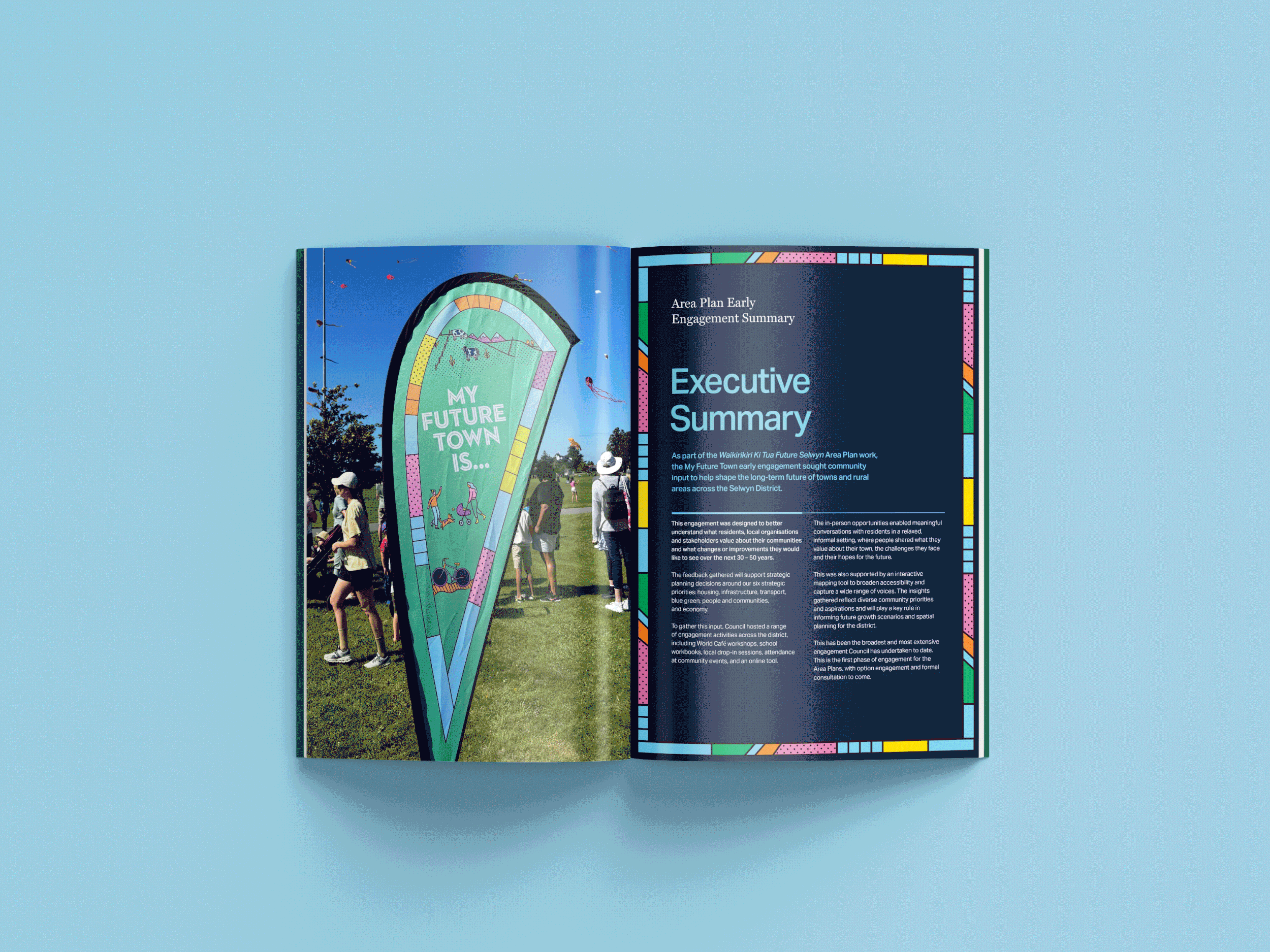 Working with Selwyn District Council and building from the established My Future Town brand identity, I designed the full Early Engagement Summary report. My role was to bring structure, clarity, and visual storytelling to a large-scale, content-heavy document.
